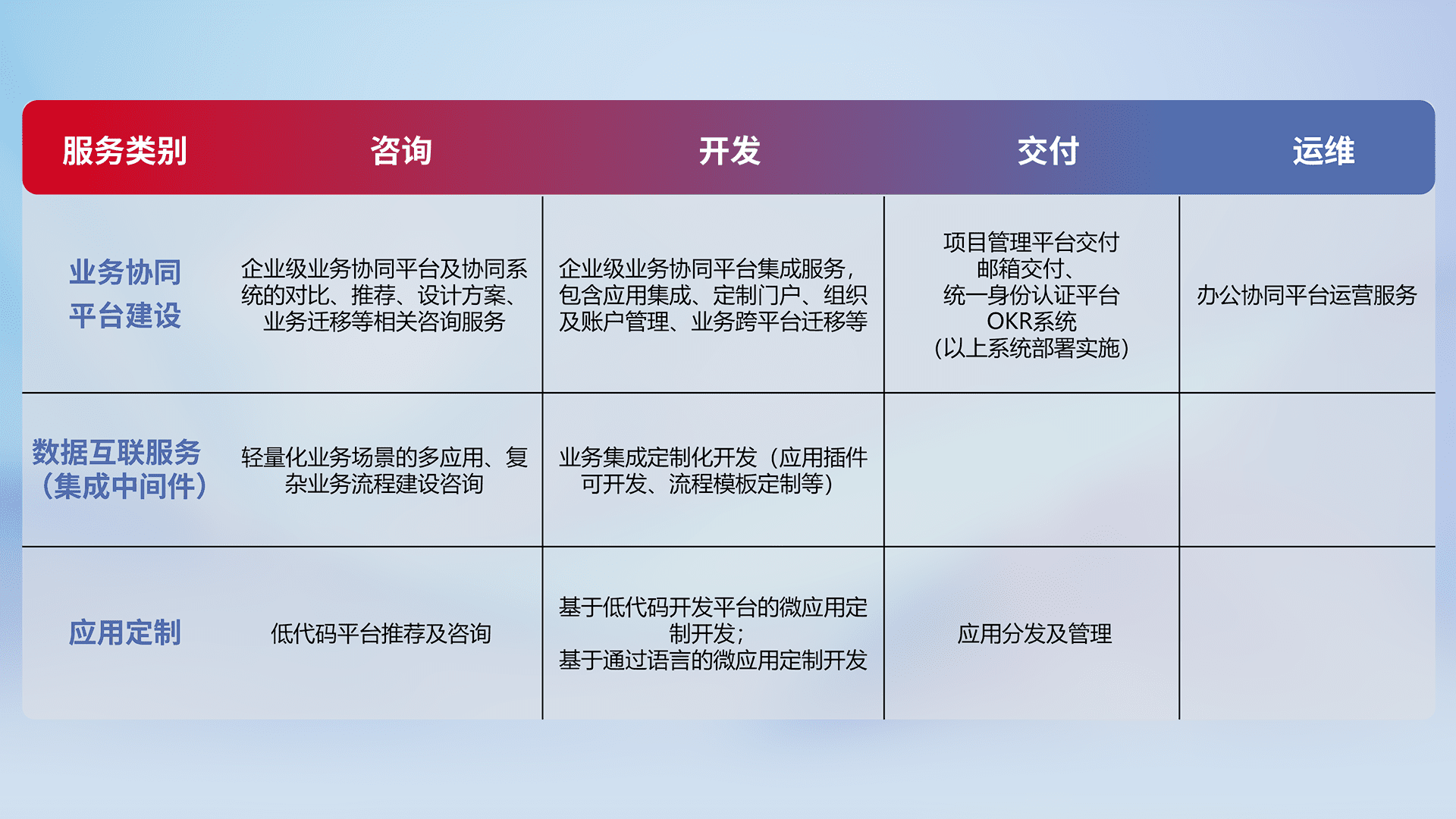 针对钉钉、、、企微、、、IDaas等平台级产品提供产品的规划、、、、方案、、、、交付、、、、定制化开发等服务,,实现如统一协同办公、、、智能客户服务、、、、混合会议管理、、、智能数据查询、、等业务场景,,,,实现数字化转型。。。。