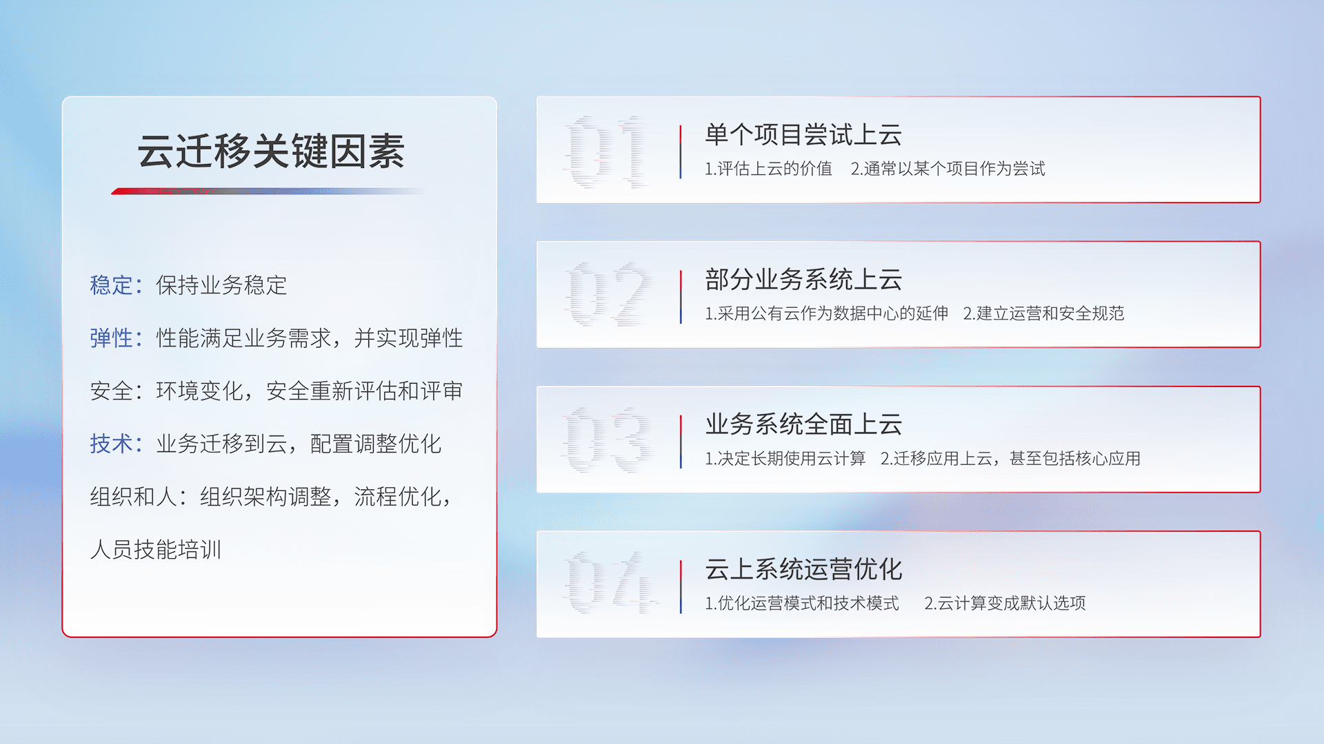 结合实际业务,,,,从规划设计、、云平台选型、、、、云原生改造、、、数据迁移、、、集成交付,,,迁移全过程为客户识别最佳上云路径,,,做好风险识别管理,,,设计网络架构、、、、身份权限、、、安全审计合规、、、、操作审计、、、、日志审计、、监控告警策略、、、多站点容灾设计等,,,对云上基础设施进行整体规划,,,,提升IT治理水平,,,以满足弹性、、高可用、、、高性能的需求。。