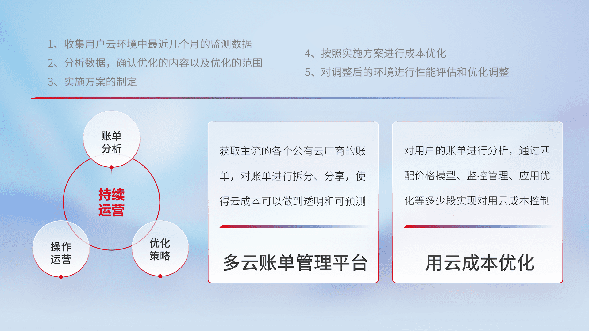 通过多云纳管,,,,以统一的资源数据模型把客户的云资源进行抽象和封装,,进而实现对多云资源的统一操作,,,,保障云资源管理的可靠性、、稳定性与可用性。。。量身定制化运维内容,,,,配置、、、开发运维、、、补丁管理、、、、备份、、、监控、、、、认证和访问管理、、、审计和日常巡检等,,保障在用云过程中的可靠度,,,稳定度以及高可用率。。。。